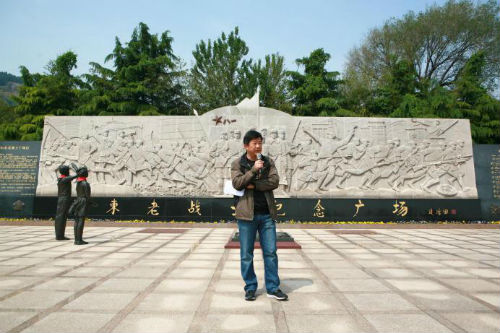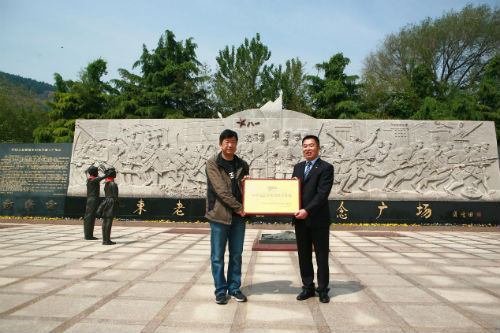 在山東老戰士紀念廣場,賈慶文同志在鐫刻著七萬多名革命先烈名字的紀念碑上找到了自己大伯父的名字,給大家分享了他的革命故事,并倡導大家向老一輩革命先烈學習。