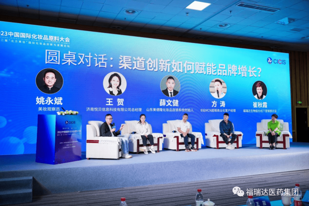 在“圓桌對話”環節,美妝觀察員姚永斌、濟南悅貝信息科技有限公司總經理王賀、山東美德隆化妝品連鎖系統創始人薛文健、B站官方MCN超萌商業化客戶經理方濤、福瑞達生物股份線下營銷部總監崔秋霞以“渠道創新如何賦能品牌增長”為主題展開討論,共同探索行業趨勢,發現渠道創新與品牌增長的方法論。