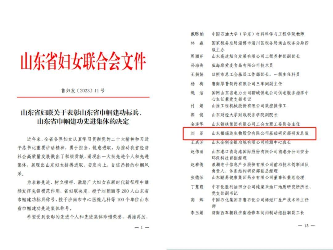 為表彰先進(jìn)、樹立榜樣,激勵廣大婦女在新時代新征程中繼續(xù)發(fā)揮先鋒模范作用,近日,省婦聯(lián)發(fā)布山東省巾幗建功標(biāo)兵、山東省巾幗建功先進(jìn)集體表彰決定,福瑞達(dá)旗下福瑞達(dá)生物股份基礎(chǔ)研究部總監(jiān)劉菲榮獲“山東省巾幗建功標(biāo)兵”稱號。