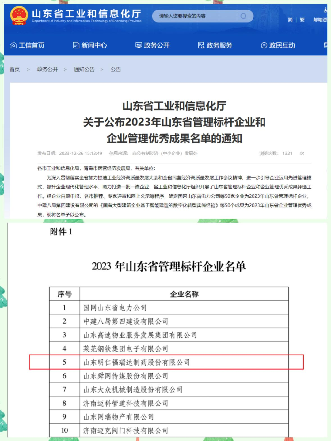 12月26日,山東省工業和信息化廳公布了2023年山東省管理標桿企業和企業管理優秀成果名單,明仁福瑞達憑借系統完備、科學規范、運行高效的現代企業管理體系成功入選首批山東省管理標桿企業。