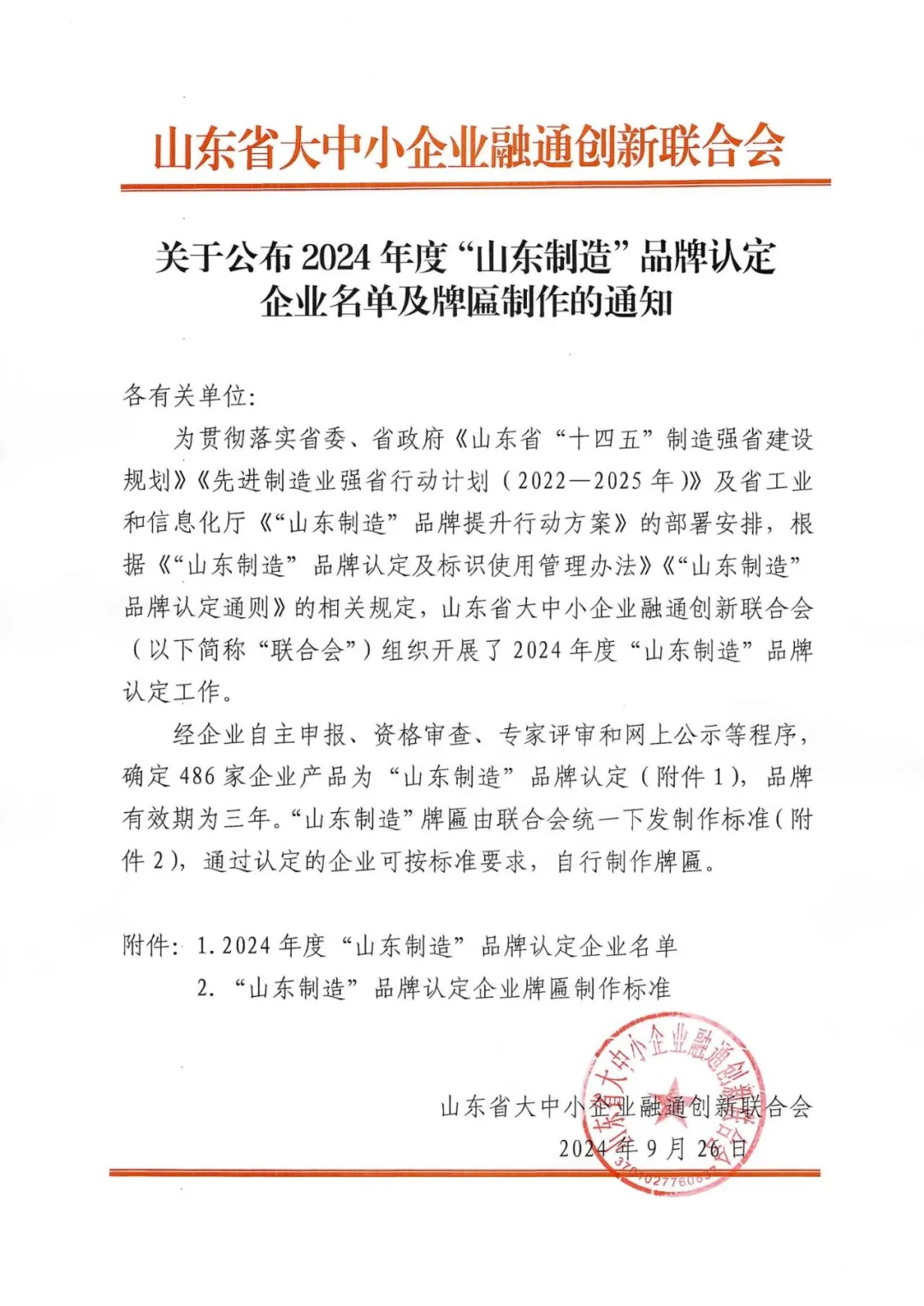 “山東制造”品牌企業由山東省大中小企業融通創新聯合會、山東省企業科技創新協會共同組織評審,是貫徹落實省委、省政府及省工業和信息化廳部署安排,加快推動制造強省和數字強省建設的重要工作,有助于提升“山東制造”品牌影響力。