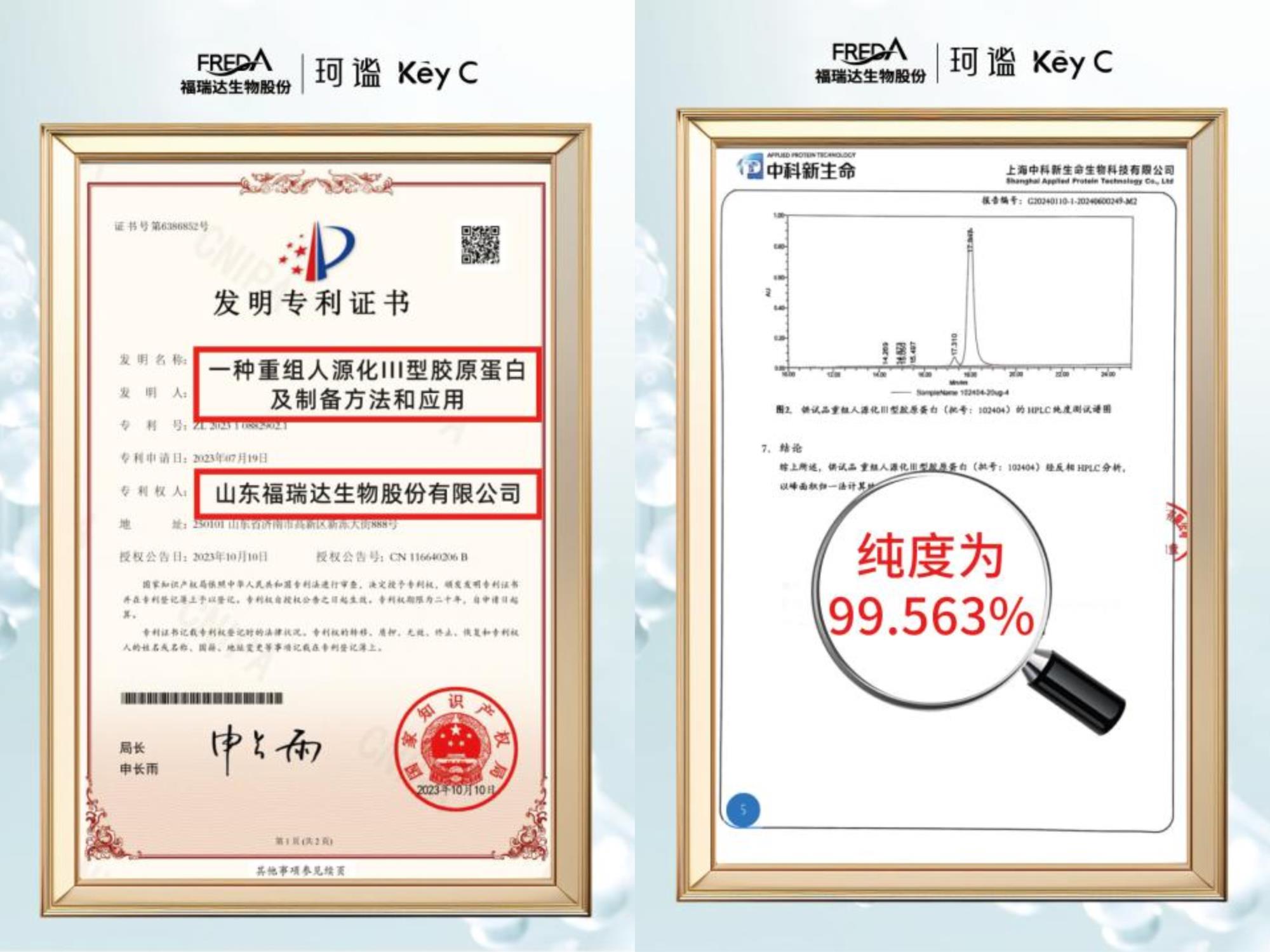 截止目前,福瑞達在重組膠原蛋白領域已構建起從原料、研發、生產到品牌運營的全產業生態,技術壁壘與產業協同能力在行業獨樹一幟。在原料端,2024年,成功完成醫用級重組Ⅲ型人源化膠原蛋白原材料主文檔登記,正式踏入醫療器械高標準賽道。投資上億元建成的膠原蛋白醫療器械智能化生產基地,是山東省首個重組膠原蛋白原料量產基地。依托福瑞達“妝藥同源”協同創新優勢,珂謐KeyC已儲備多項專利技術,為產品的持續迭代提供了堅實支撐。