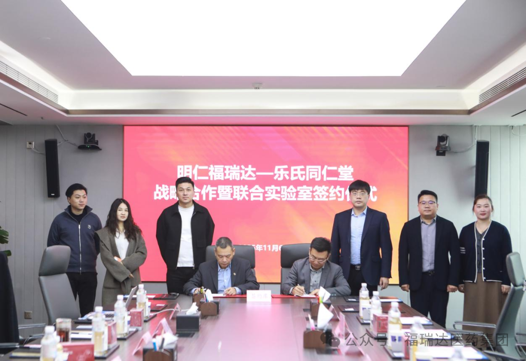 2025年11月7日上午,明仁福瑞達與臺灣樂氏同仁堂舉行戰略合作簽約儀式。樂氏同仁堂董事長、第十四代傳人樂覺心,與福瑞達黨委委員、副總經理,明仁福瑞達董事長、總經理徐傳彬共同簽署戰略合作協議,并為“明仁福瑞達—樂氏同仁堂聯合實驗室”揭牌。雙方合作推出的首款藥食同源功能性食品——“阿膠雪妍飲”正式投產上市。